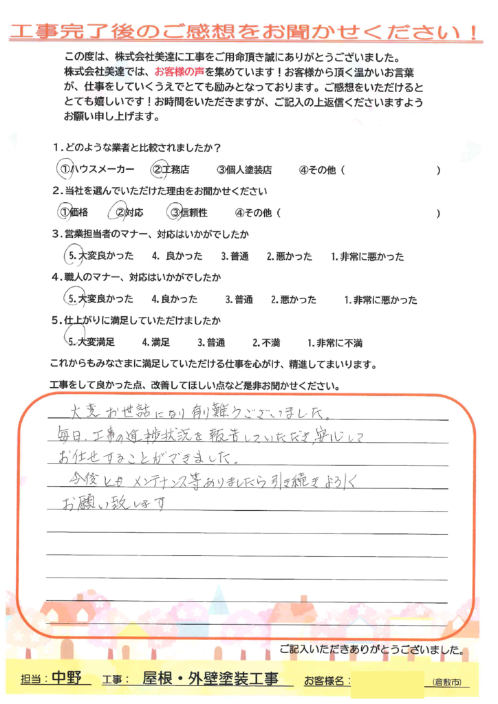 工事期間中、進捗報告について安心してお任せいただけたとのお言葉を頂戴し、大変嬉しく思っております。