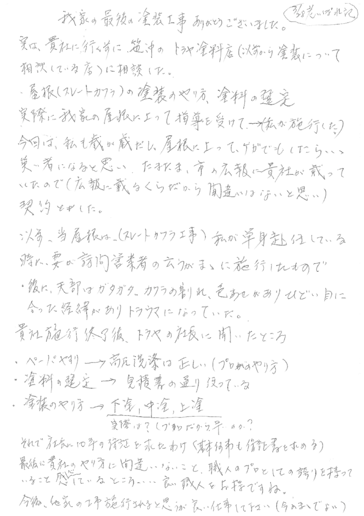 今回は、私も歳が歳だし、屋根に上がって、ケガでもしたら、、、笑い者になると思い、たまたま市の広報に貴社が載っていたので(広報に載るくらいだから間違いはないと思い)契約とした。